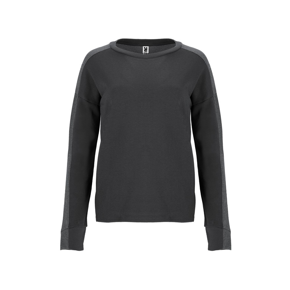 Блокинговый свитшот для женщин из двух цветов одного полотна. Горловина, манжеты и низ спинки из риба 2х1. Манжеты асимметричной формы. Разрезы в боковых швах, спинка немного длиннее переда.