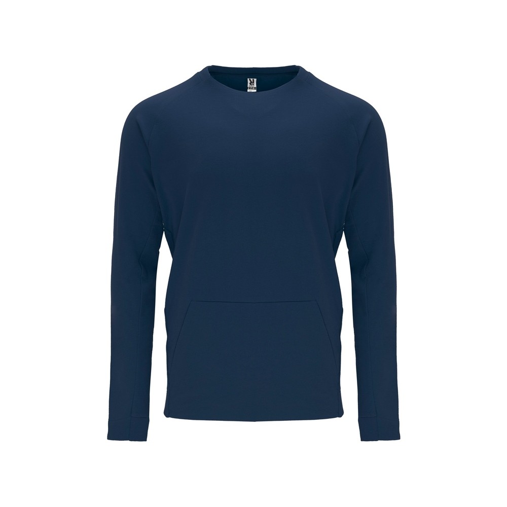 Свитшот с рукавом реглан. Горловина спинки и боковая часть манжет из риба 1х1. Карман кенгуру, диагональные боковые швы с наклонам к центру переда.