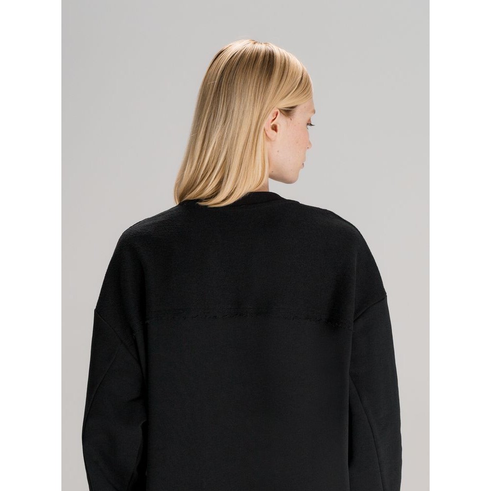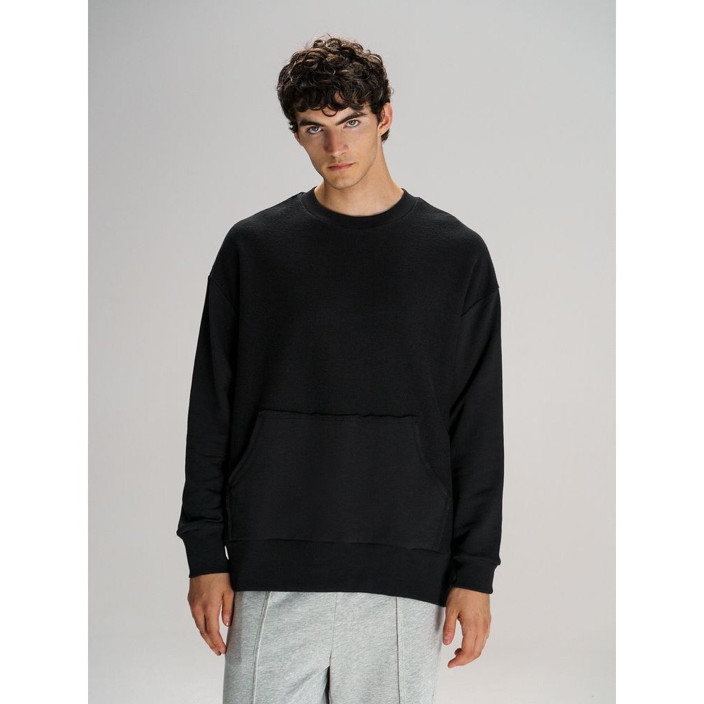 Благодаря особой конструкции, где часть деталей — перед и спинка — вывернута наизнанку, свитшот приобретает запоминающийся вид. Так внутренняя, обычно незаметная сторона материала превращается в лицевую: миниатюрные петельки бывшей изнанки становятся настоящим украшением толстовки, добавляя ей оригинальности и эффект невероятно приятной плюшевости.