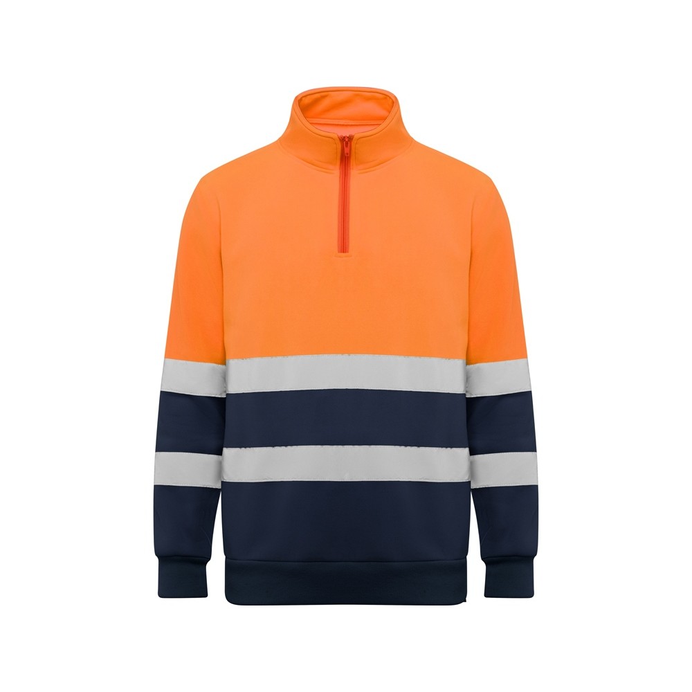 Свитшот с воротом на молнии, предназначен для использования в условиях плохой видимости. Внутри воротника отстрочка для усиления. Горизонтальные полоски со светоотражением на груди и рукавах. Манжеты и низ из рибовой ткани 1х1.