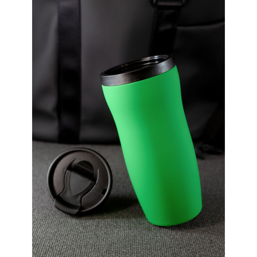 Двухслойная конструкция из нержавеющей стали снаружи и пищевого пластика внутри. Герметичная завинчивающаяся крышка с откидным клапаном для питья. Покрытие софт-тач. В отверстие в крышке можно вставить шнурок для удобного ношения стакана на руке. Шнурок в комплект не входит.