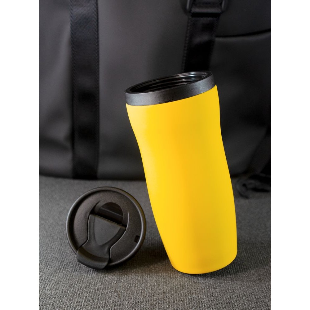 Двухслойная конструкция из нержавеющей стали снаружи и пищевого пластика внутри. Герметичная завинчивающаяся крышка с откидным клапаном для питья. Покрытие софт-тач. В отверстие в крышке можно вставить шнурок для удобного ношения стакана на руке. Шнурок в комплект не входит.