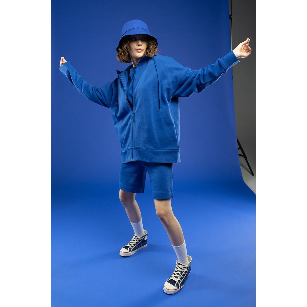 Толстовка унисекс на молнии со спущенным плечом.
