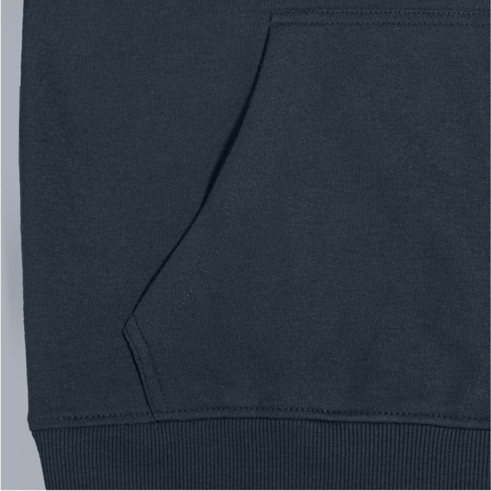 Капюшон затягивается шнурком-кулиской с прорезиненными эглетами. На передней стороне изделия два удобных кармана кенгуру. Манжеты и низ обработаны рибом 2х2.