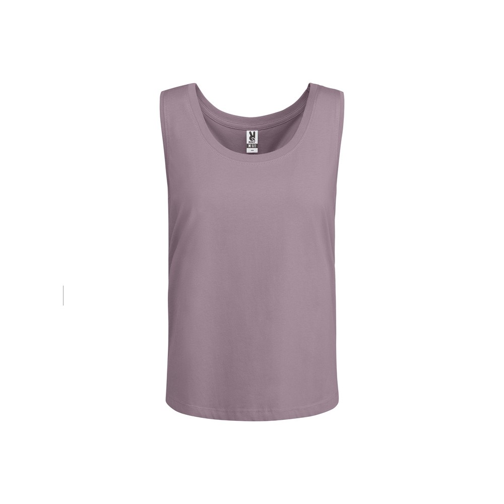 Свободная женская футболка с широкими бретелями. Вырез и проймы обработаны бейкой из риба 1x1. Подол округлой формы. Боковые швы.
