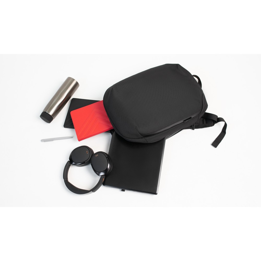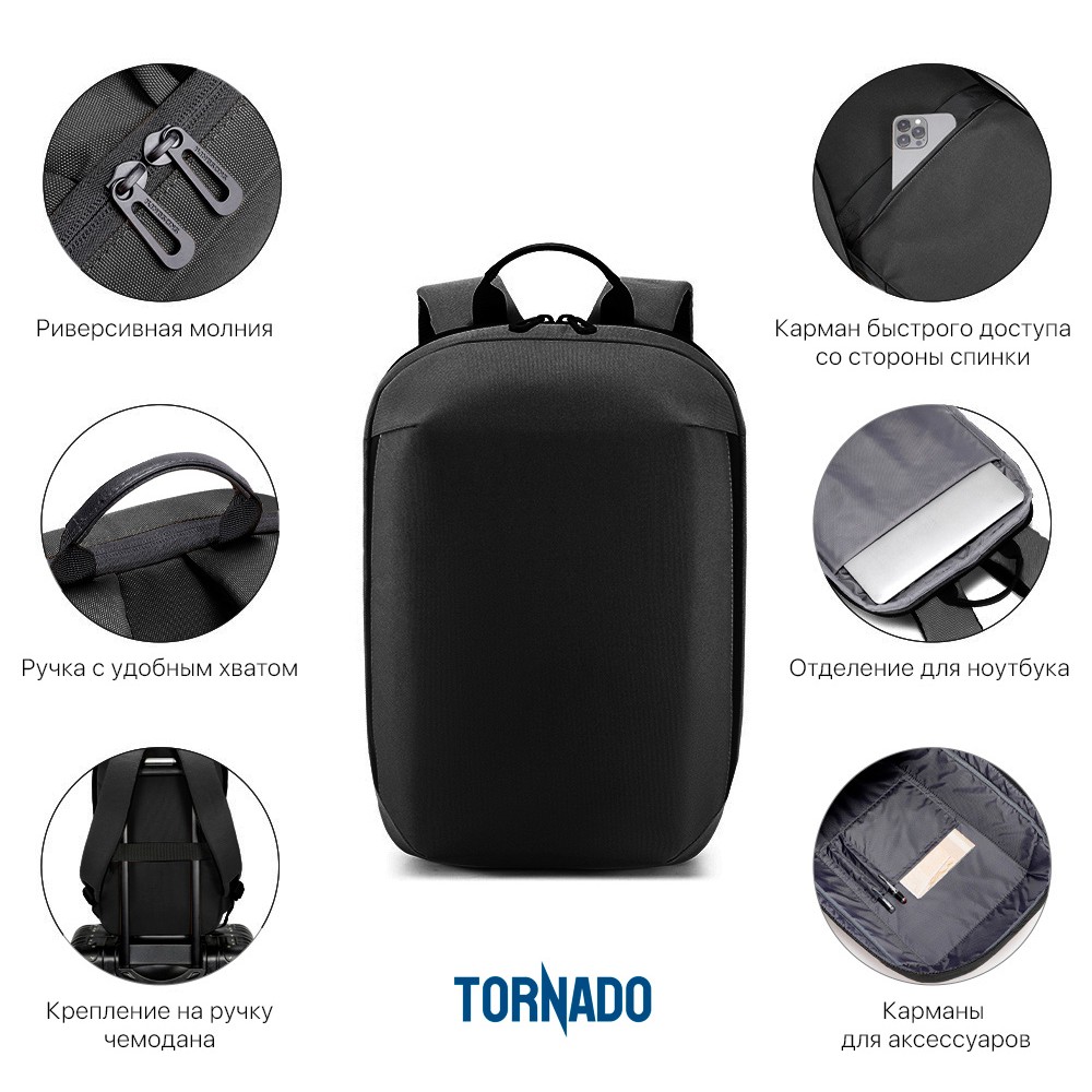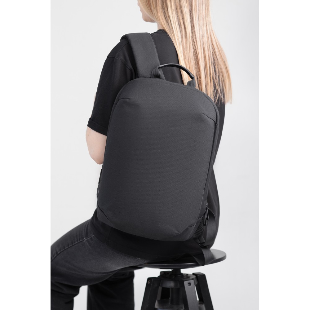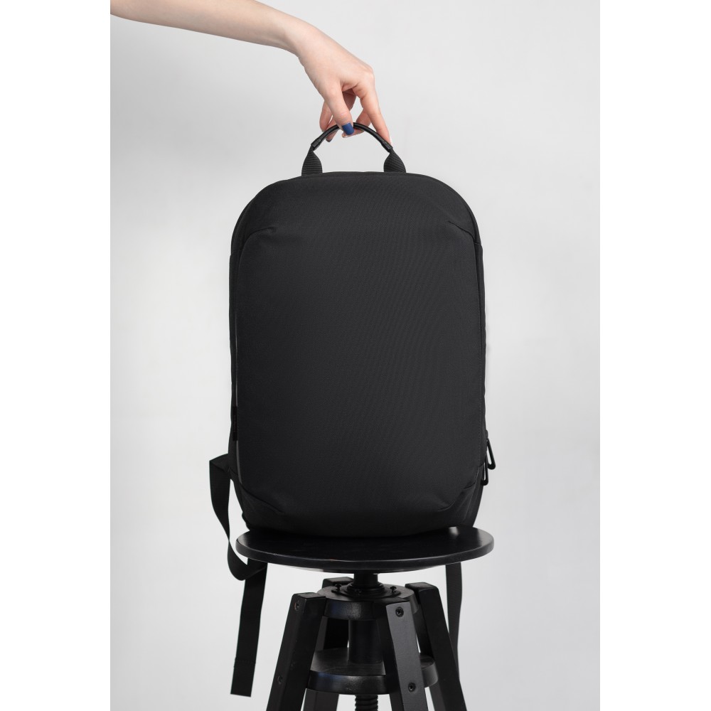 Рюкзак "Balance" для тех кому важна практичность. Основной материал - переработанный пластик (rPET) c пыле-/влагозащитой. Отсутствие карманов с внешней стороны в угоду минимализму и для защиты от краж. Риверсивная молния основного отделения придает целостный законченный вид, при необходимости на пуллеры можно установить багажный кодовый замок. Крепление на ручку чемодана со стороны спинки, быстрая регулировка длины лямок.