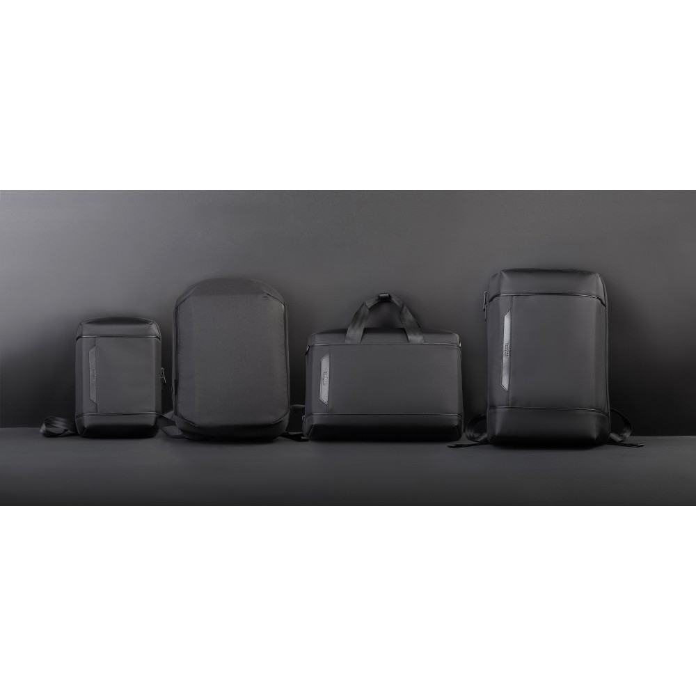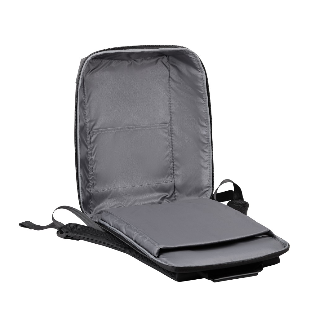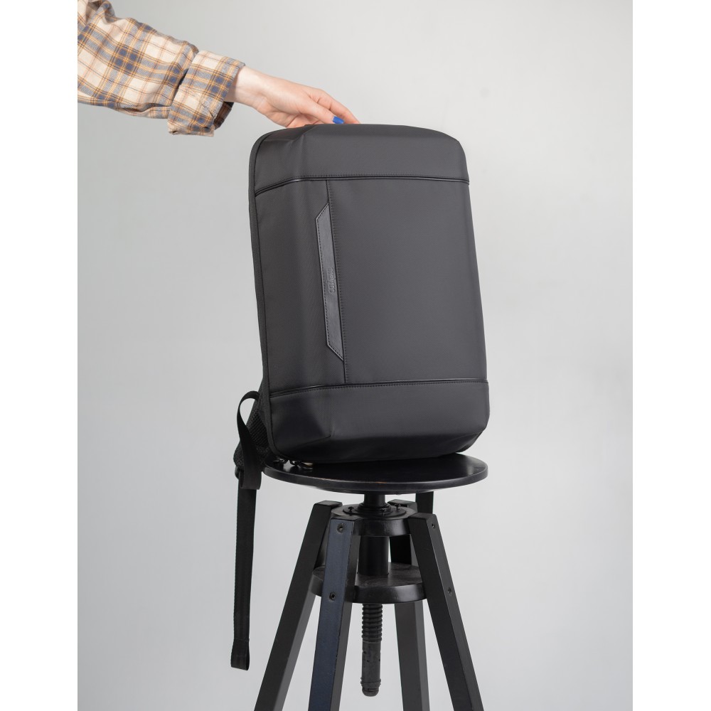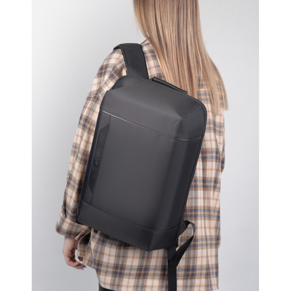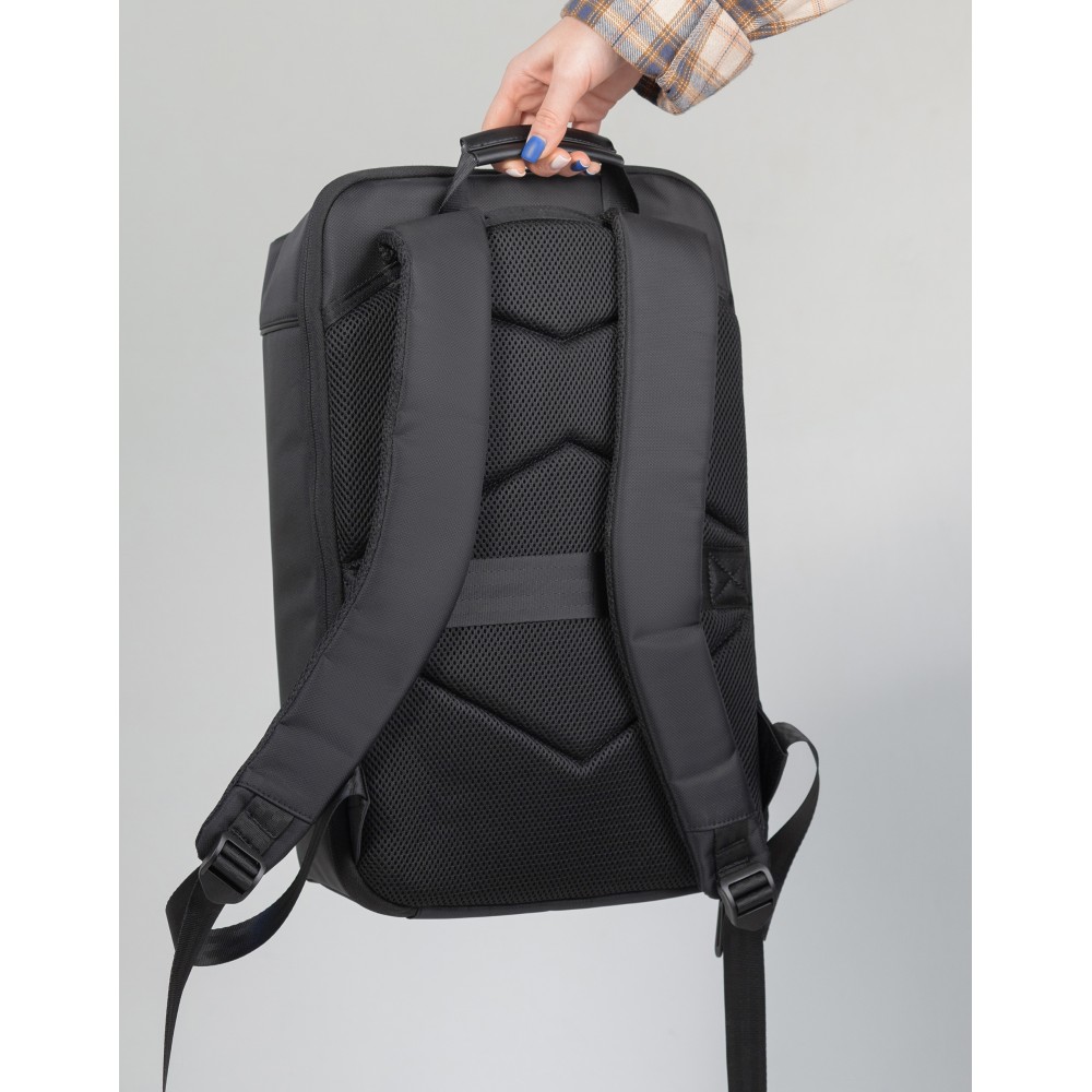 Стильный городской рюкзак для урбаниста. Аккуратный, держит форму, визуально приятный материал с красивым рисунком и гидрофобной обработкой, плотность 572 гр/м2. Удобный на каждый день, мягкая дышащая спинка, крепление на ручку чемодана. Строгая цветовая гамма черный + серый, минимализм в деталях. С внешней стороны нет карманов, риверсивная молния основного отделения с вырезами на пуллерах для установки замка. Открытие на 180º для легкого доступа к содержимому, объем 14 литров.