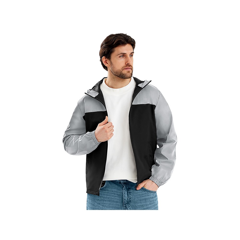Streetwear-ветровка с контрастным дизайном: верх переда и спинки, рукава и капюшон — из светоотражающей ткани, низ — из прочной чёрной полиэстеровой ткани. Модель на подкладке, со спинкой длиннее переда. Детали: водонепроницаемая молния, боковые наклонные карманы с листочкой, манжеты на резинке, удобный капюшон, кулиска по низу. • Заметность в темноте — светоотражающая верхняя часть повышает безопасность. • Защита от ветра и дождя — влагостойкая молния и плотная ткань. • Комфортная посадка — удлинённая спинка и подкладка для межсезонья. • Универсальный городской стиль — легко сочетается с повседневным гардеробом.