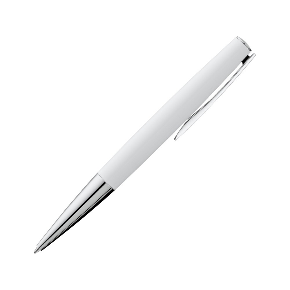 Металлическая шариковая ручка с поворотным механизмом, глянцевым тонированным корпусом в белом цвете, пружинным металлическим клипом и тяжелым металлическим наконечником с глянцевой хромированной отделкой.