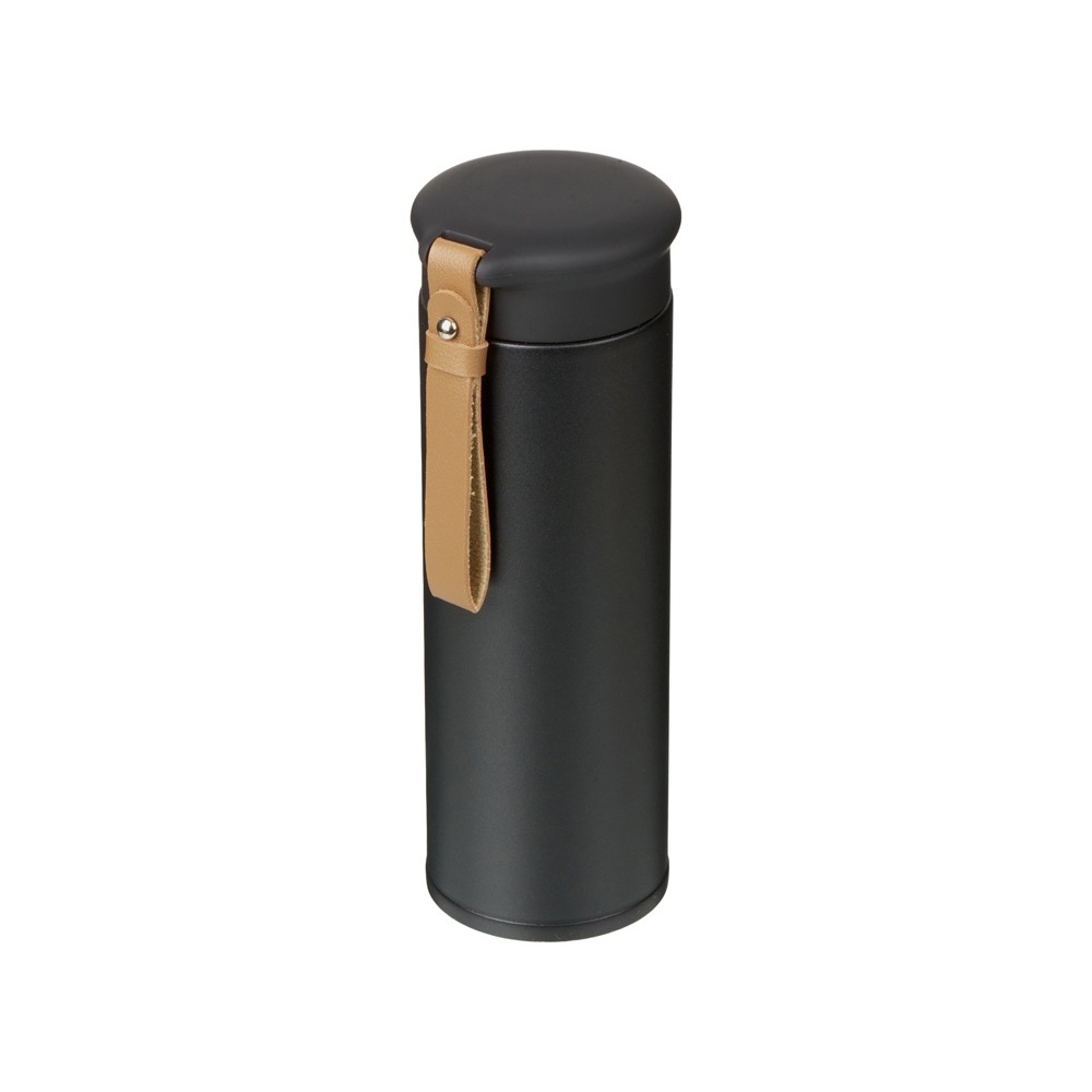 Термос герметично завинчивается на крышку, оснащенную съемным ремешком из качественной ПУ кожи. Крышка имеет прорезиненное покрытие, что создает интересное сочетание текстур в рамках одной модели. Корпус имеет элегантную рельефную поверхность с антискользящим эффектом.