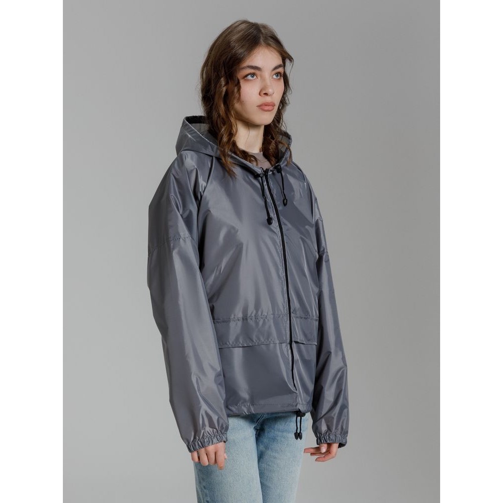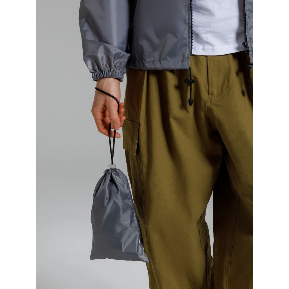 Укороченный дождевик свободного кроя из ткани таффета с влагозащитным покрытием. Складывается в мешочек — удобно брать с собой.