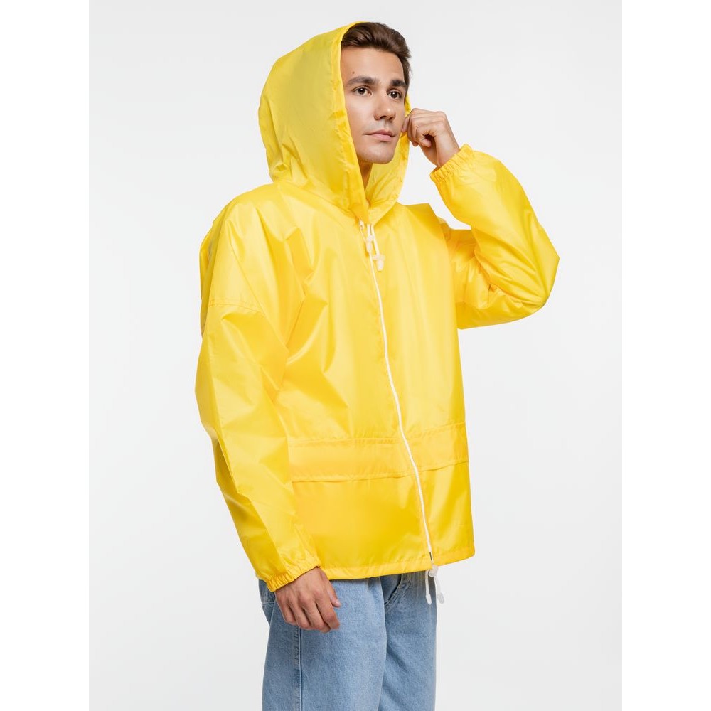Укороченный дождевик свободного кроя из ткани таффета с влагозащитным покрытием. Складывается в мешочек — удобно брать с собой.