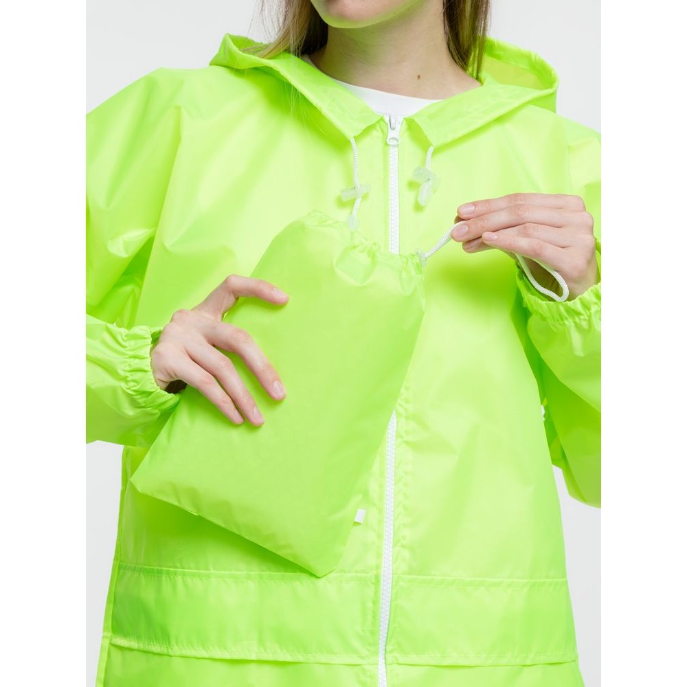 Укороченный дождевик свободного кроя из ткани таффета с влагозащитным покрытием. Складывается в мешочек — удобно брать с собой.