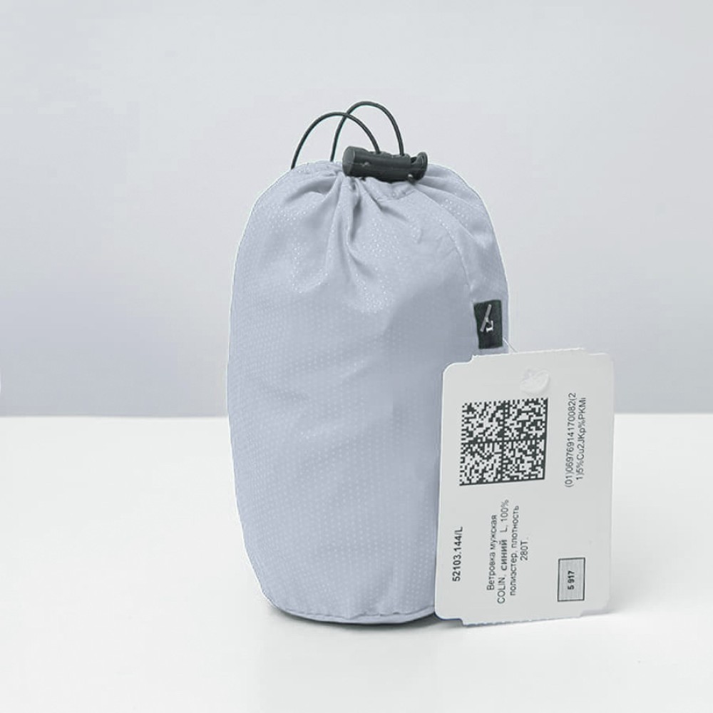 Несмотря на лаконичный дизайн, ветровки COLIN выгодно выделяются на фоне других промо-ветровок нанесенным на ткань микропринтом. Каждое изделие поставляется в сумке-футляре из основной ткани, на которой указан размер содержащегося в ней изделия, а также маркировка "Честный Знак".