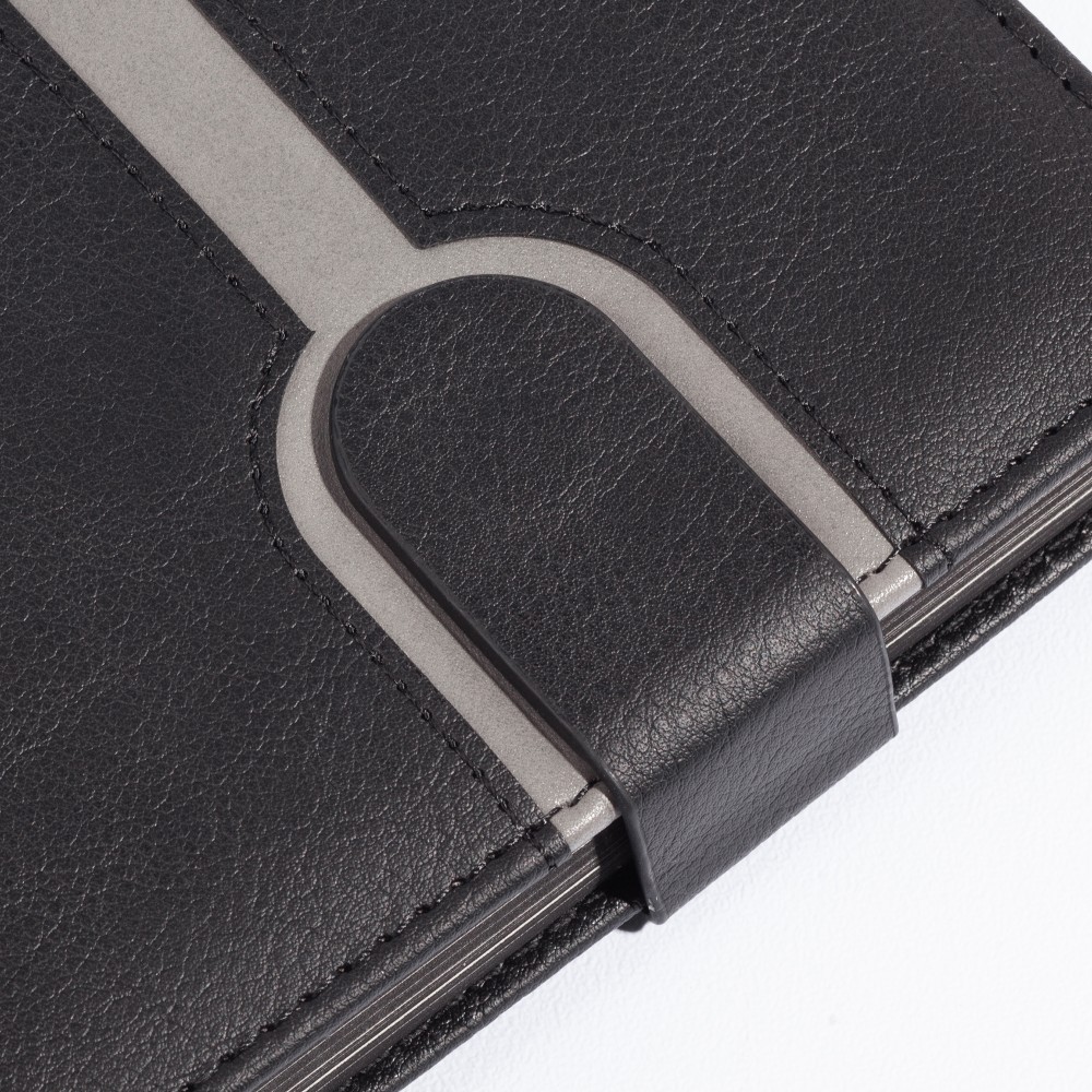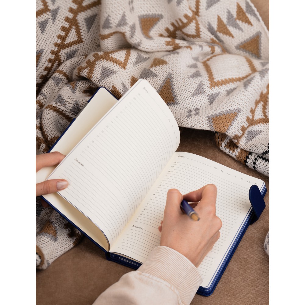 Матовая плотная обложка с выраженной текстурой натуральной кожи дополнена стильным вырезом – полосой серого цвета с прошивкой по периметру. Внутренний блок включает 256 страниц из бумаги плотностью 70 гр., срезом в цвет обложки и закладкой-ляссе, благодаря которой его удобно сразу открывать на нужной странице.