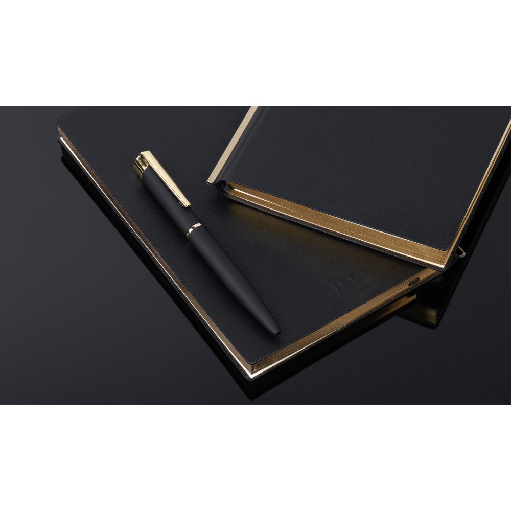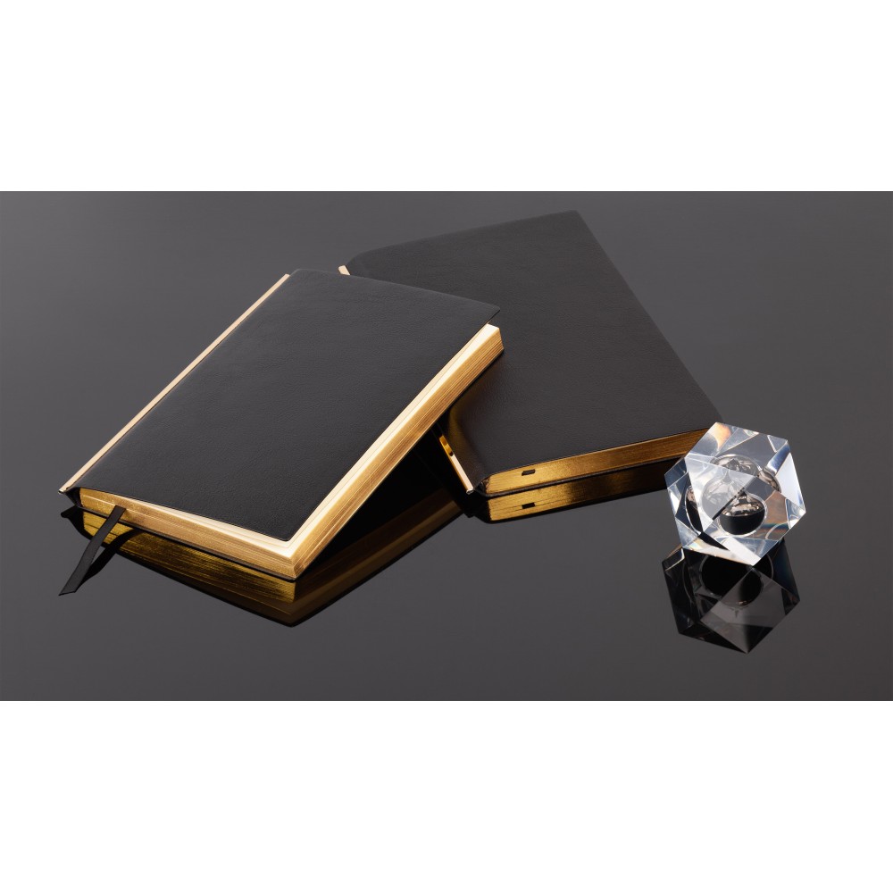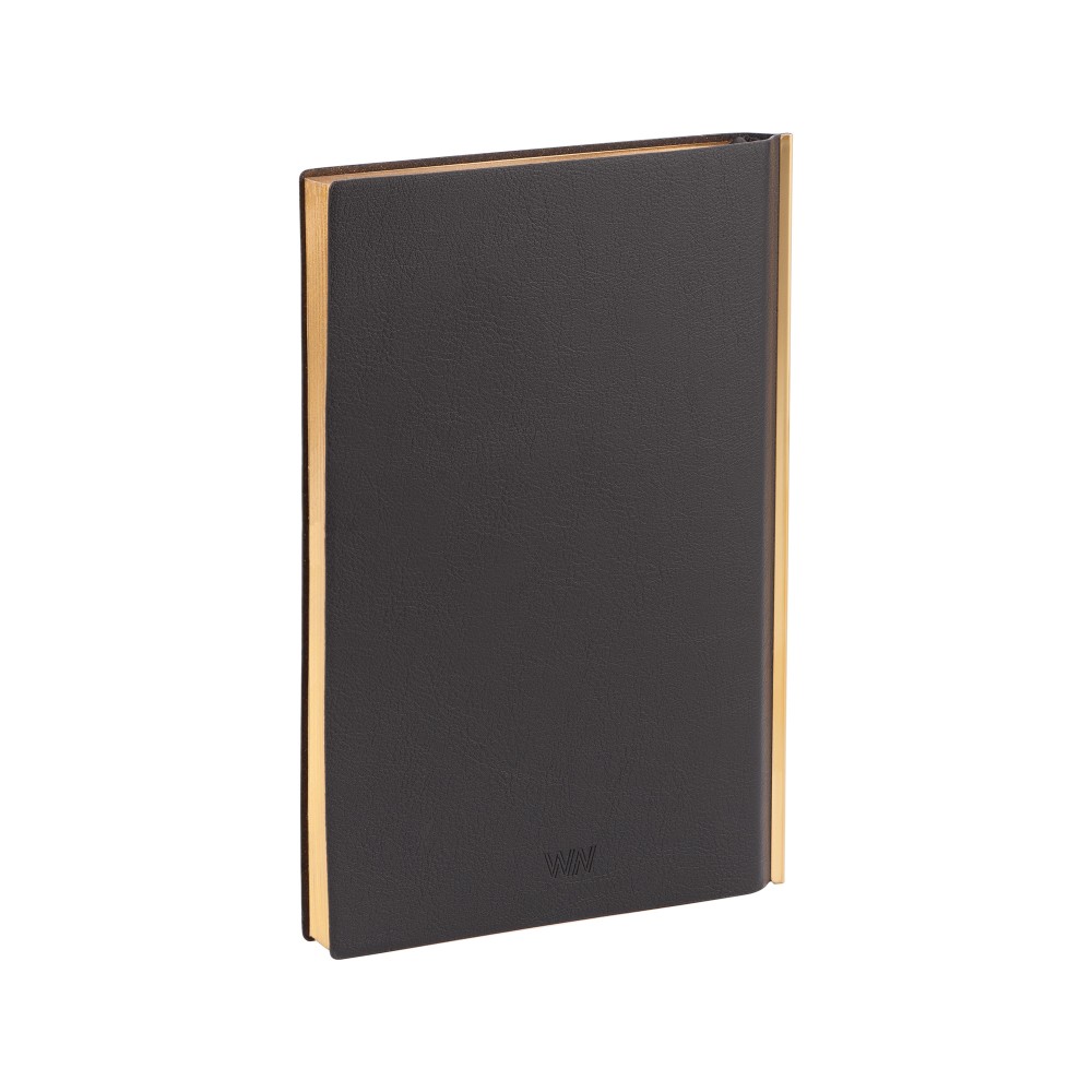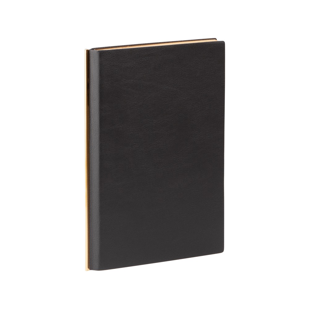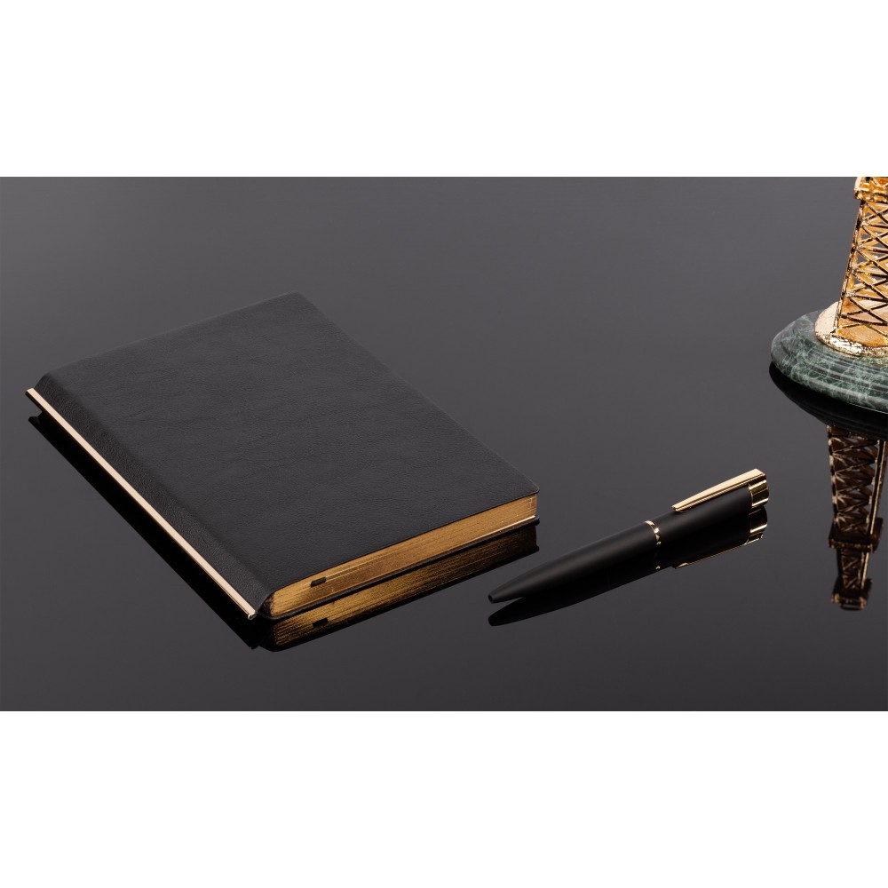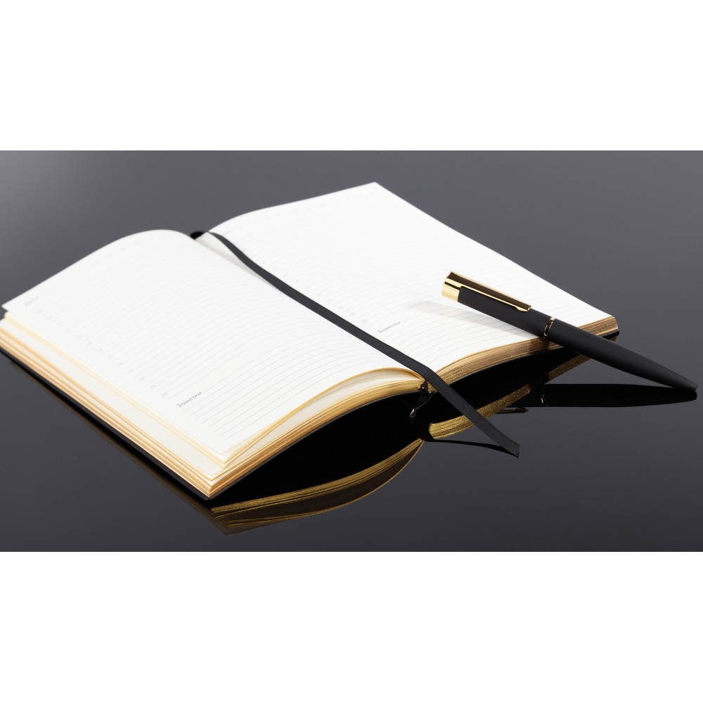 Сочетание черной гибкой фактурной обложки, золотистой металлической планки и золотого среза смотрится в меру дорого. Блок из плотной тонированной бумаги в 256 страниц представляет достаточно места для записей.