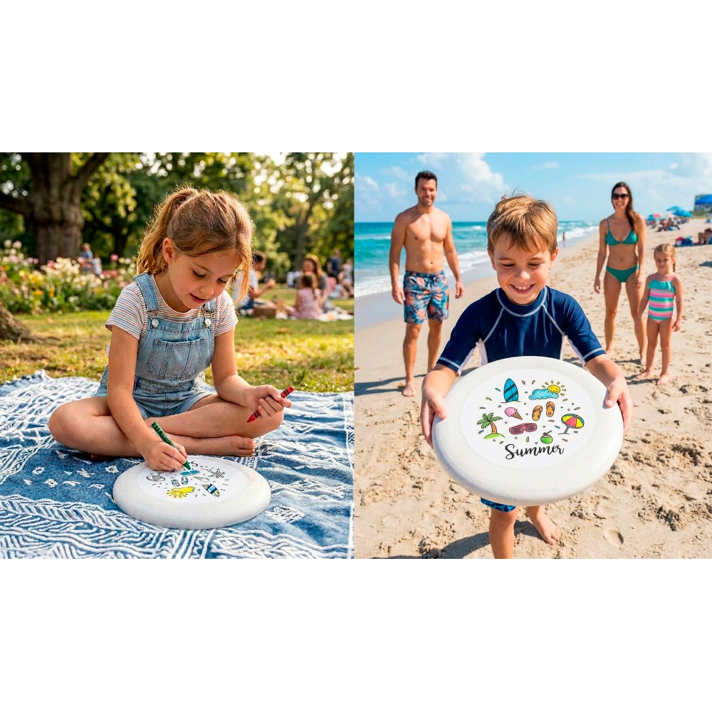 Лето – время ярких красок, веселья и активностей. Новинка – фрисби-раскраска для игр и творчества. 6 восковых карандашей в комплекте, яркие оттенки для создания авторской тарелки. Простая активная игра для 2 и более человек, идеальна для прогулок, пикников, дней рождения и отдыха на пляже. Восковые карандаши безопасны, не пачкают одежду, корпус тарелки изготовлен из пластика с добавлением растительных волокон.