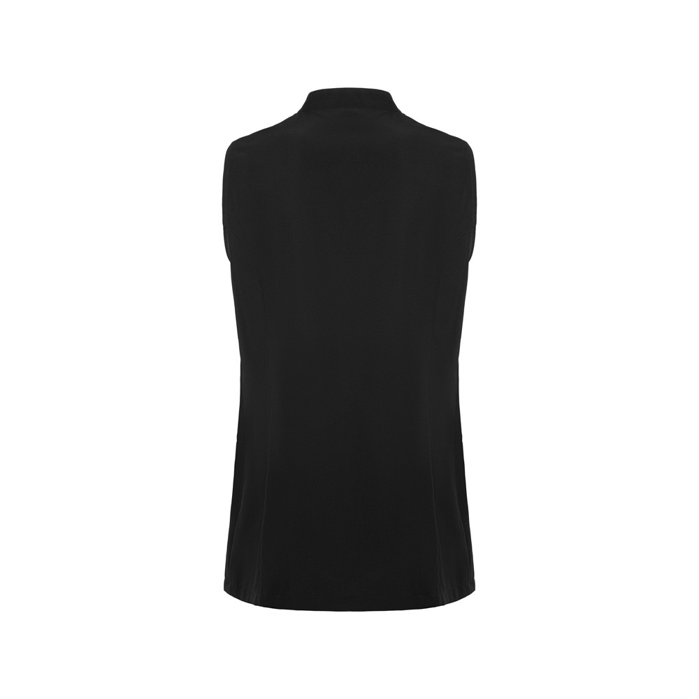 Жилетка без рукавов. Застежка спереди со скрытыми кнопками-застежками. Воротник-стойка, боковые вставки и складки в области груди. Два передних накладных кармана.