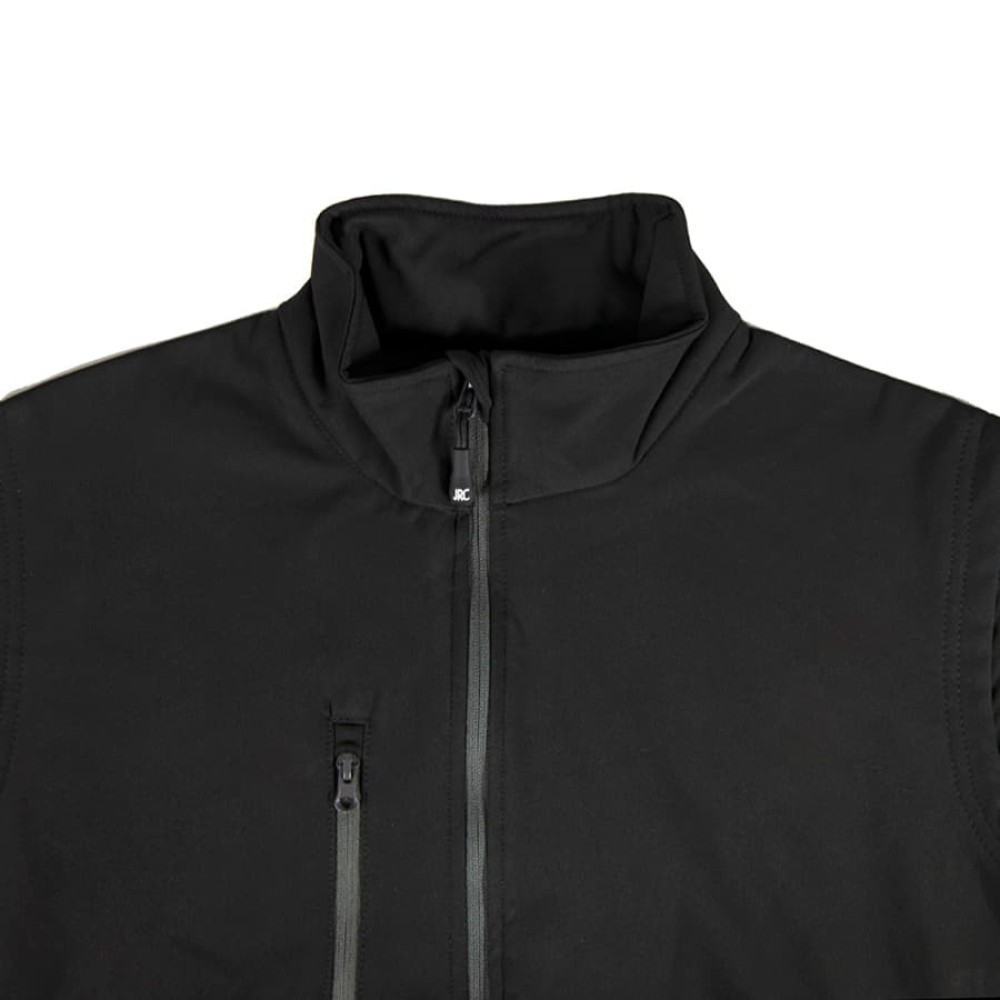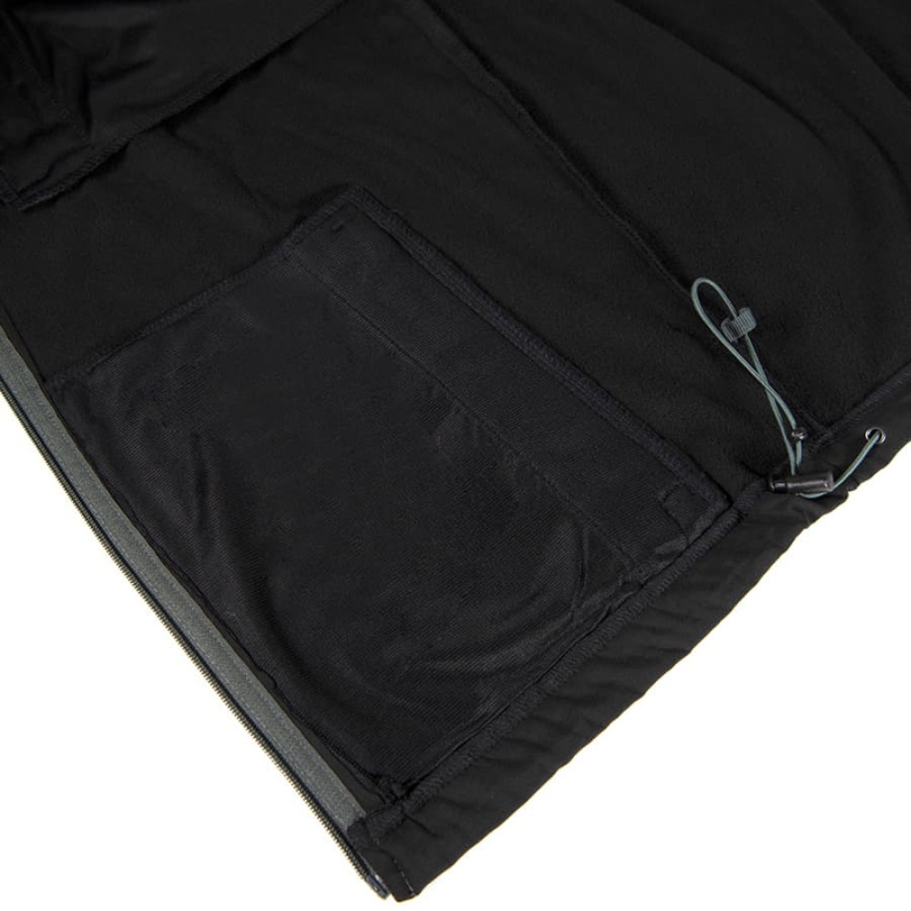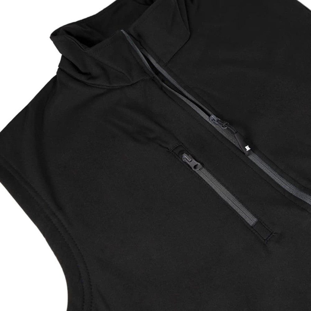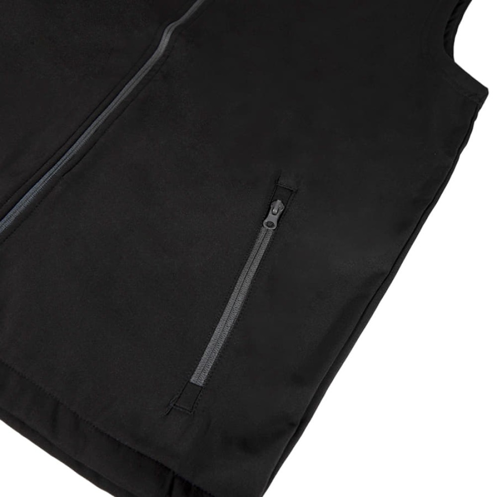 Двухслойная ткань softshell. Водонепроницаемый и дышащий мужской жилет. Небольшой воротник-стойка. Обратная контрастная пластиковая молния со съемным пуллером. Один нагрудный и два боковых кармана с обратной молнией. Утягивающий шнурок по низу жилета.