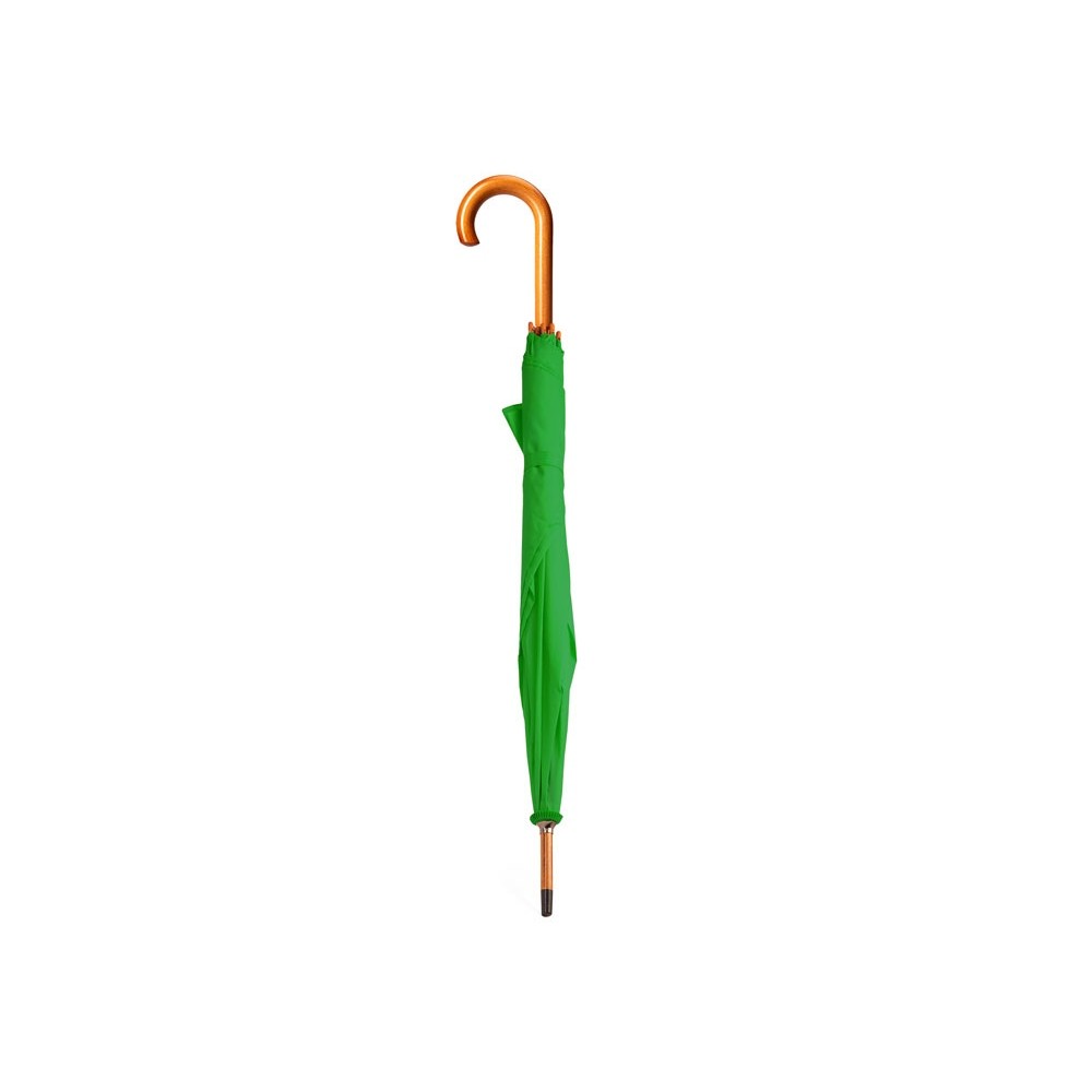 Механический зонт с ручкой, стержнем и наконечниками из дерева. Спицы черного цвета. Застежка-липучка в тон. 105 см в диаметре.
