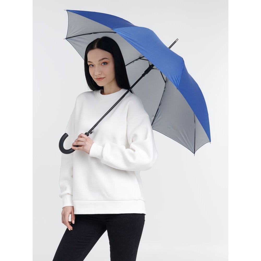 Легкий зонт-трость классической формы, который выглядит нескучно благодаря современным деталям исполнения — серебристому покрытию на внутренней части купола и мягкой прорезиненной ручке.