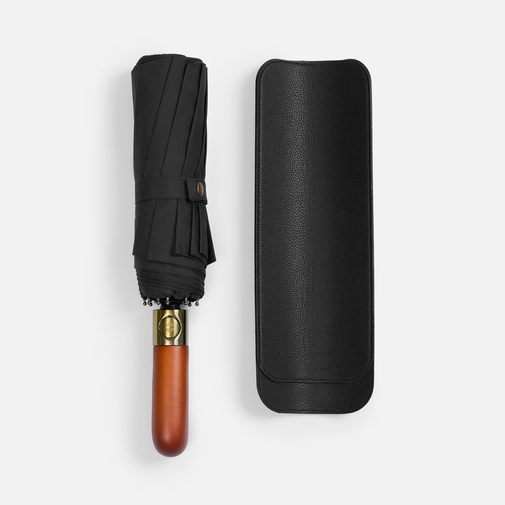 Складной зонт с большим куполом, системой антишторм и эргономичной ручкой из дерева.